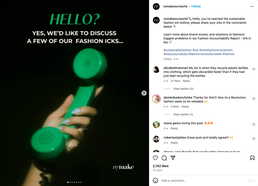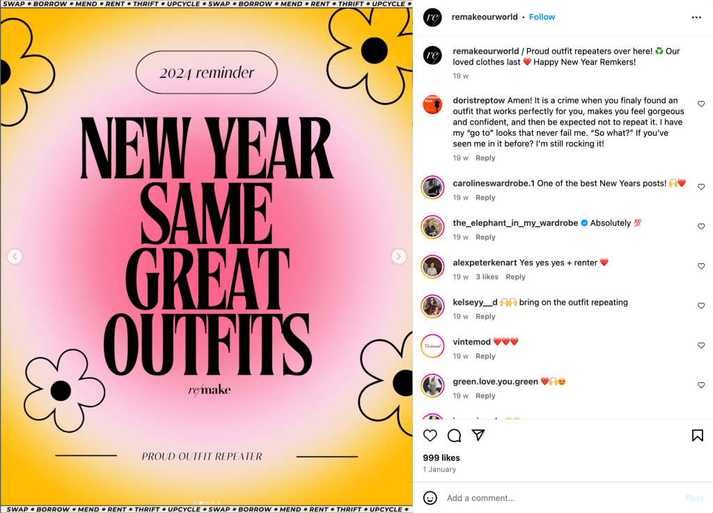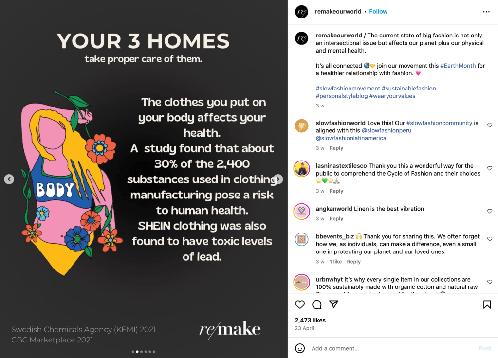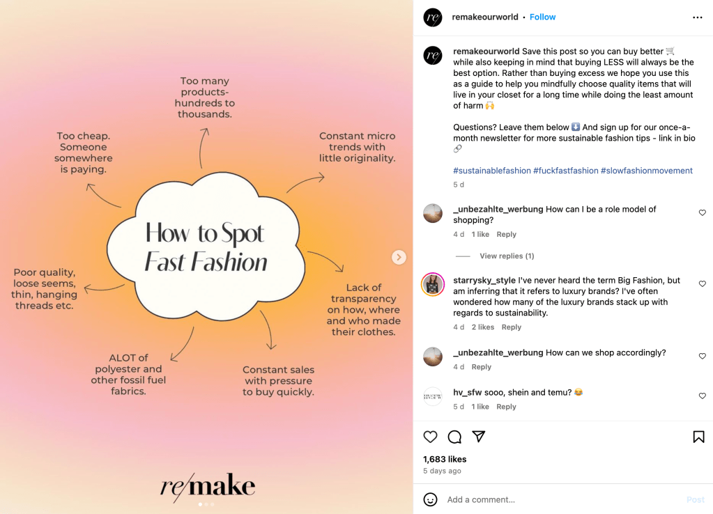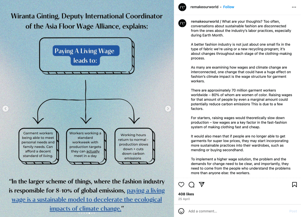 Remake is an organization dedicated to improving the fashion industry by advocating for workers’ rights, increased wages, and climate justice. Beyond just using words on photos, Remake uses appealing graphics that keep their followers engaged. Heres what we can learn.