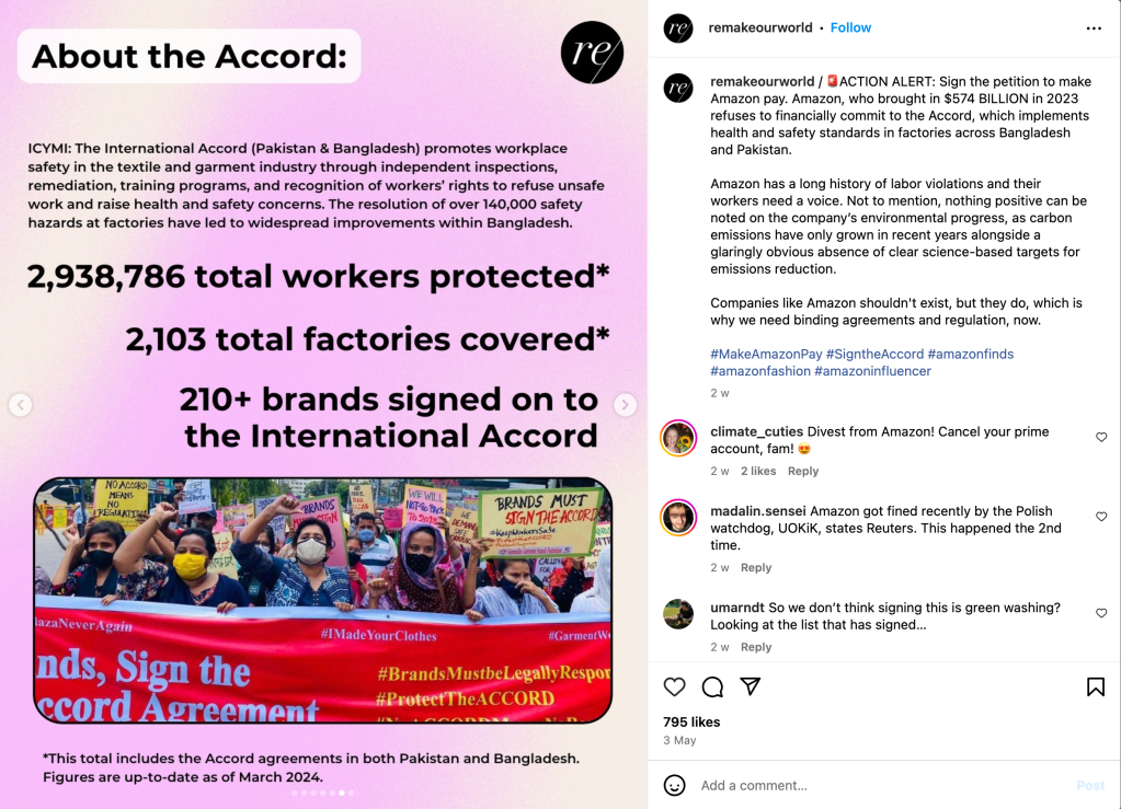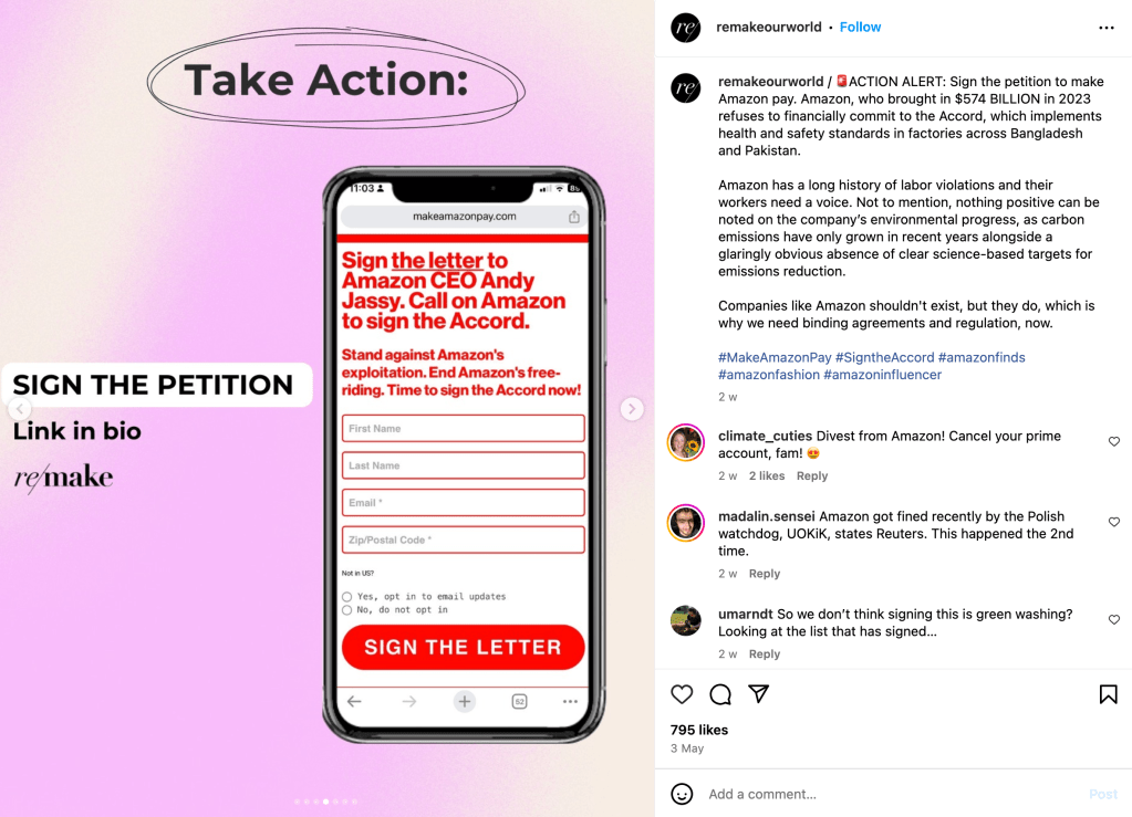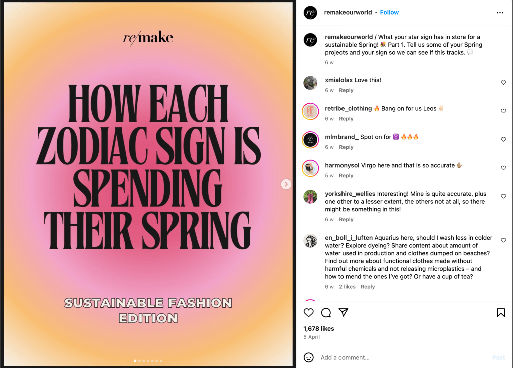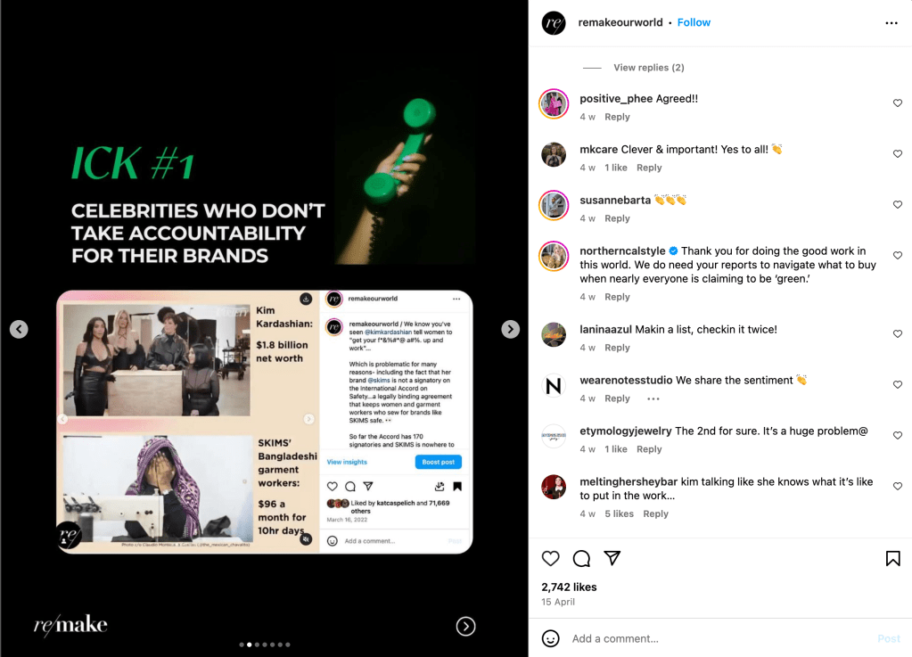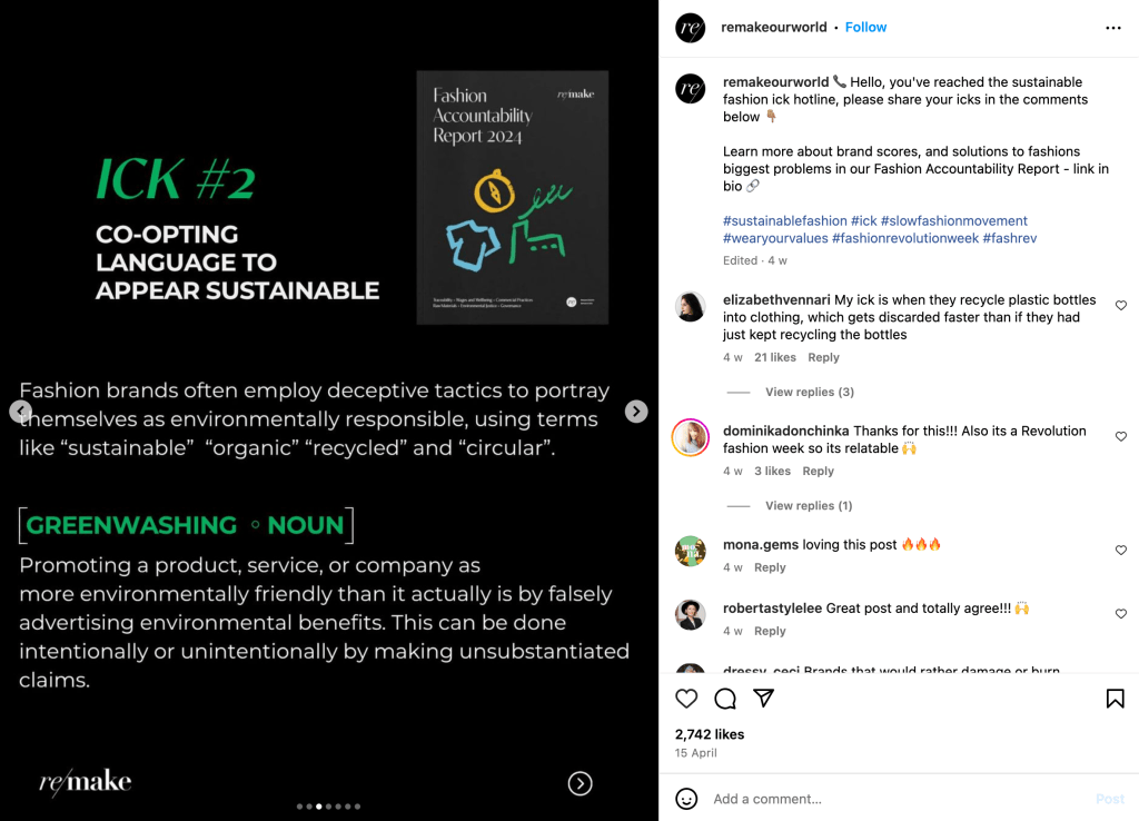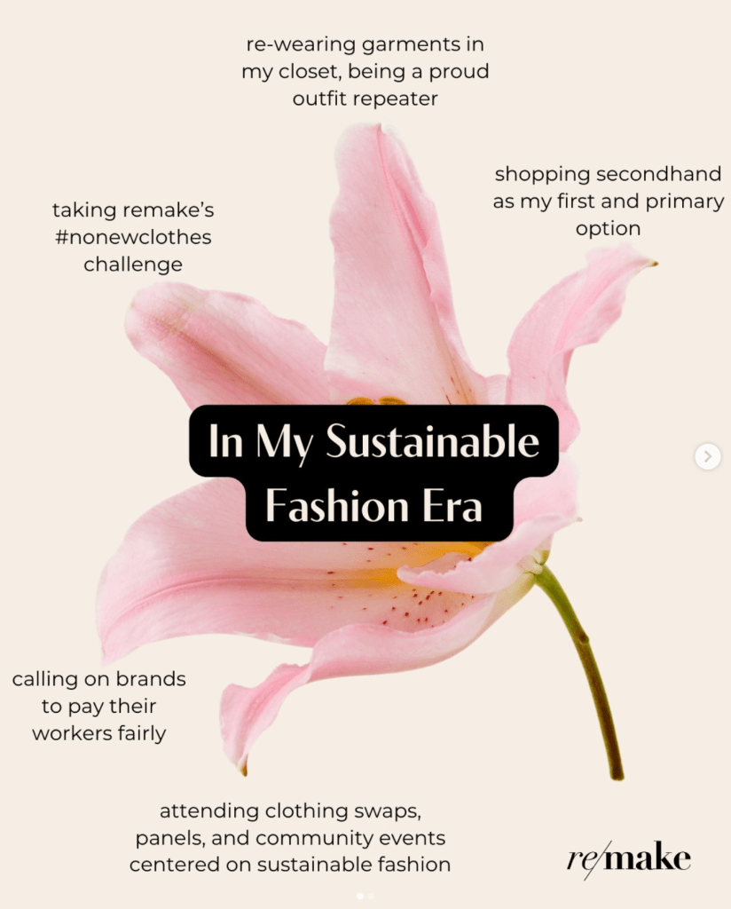 Remake is an organization dedicated to improving the fashion industry by advocating for workers’ rights, increased wages, and climate justice. Beyond just using words on photos, Remake uses appealing graphics that keep their followers engaged. Heres what we can learn.