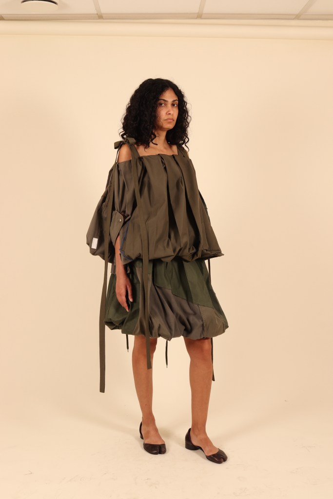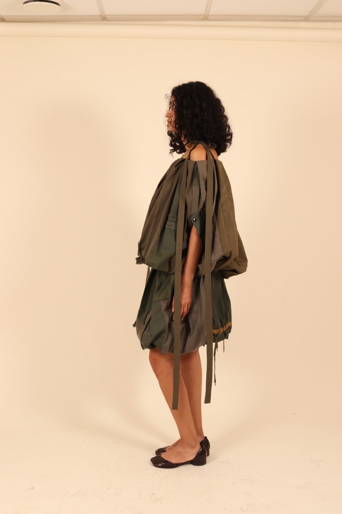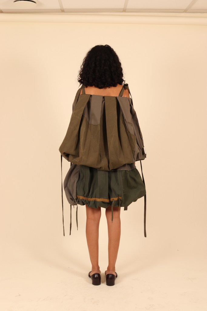 Created from vintage army uniforms and clothing, all hand sourced by me, from various flea markets and vintage shops in Paris. Inspired by early Christobal Balenciaga silhouettes, this two-piece garment is a dystopian approach to luxury fashion.