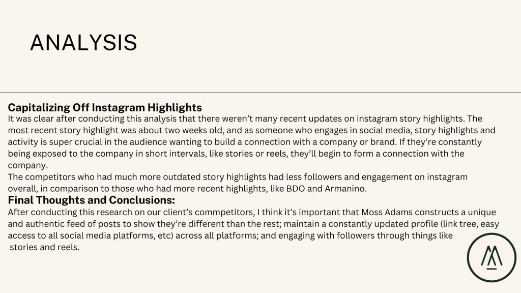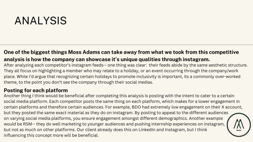As a part of my “J480: Strategic Social Media” course, I conducted a competitive analysis for a real-world client to analyze the client’s opportunities for growth on social media.