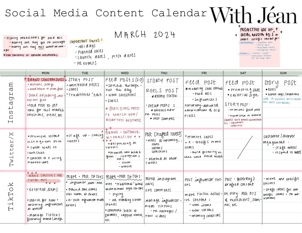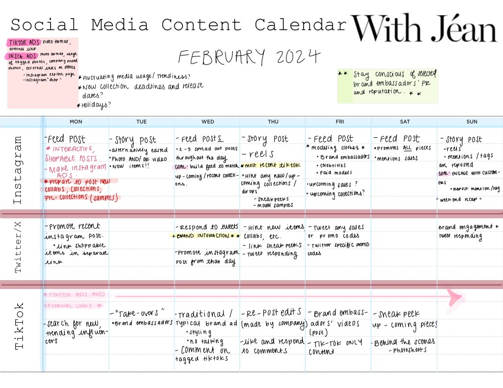 For my “J350: Principles of Public Relations” course, I made a hypothetical six-week social media content calendar for the clothing brand With Jéan. In order to complete this assignment, I had thoughtfully and creatively come up with posting patterns that would uphold the brand’s success. I closely analyzed the brand’s current and target demographics, as well as its types of posts and posting patterns on each social media platform.